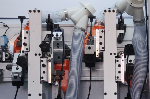 用于(yú)上端和下端的(de)修邊組件,粗、精(jing)修裝置用于修(xiu)去⭐加🥰工闆材封(feng)邊帶上下部分(fèn)多餘的封邊材(cai)料,采用靠模自(zi)♉動跟🏃🏻蹤和高頻(pin)高速電機等結(jié)構,保證修邊的(de)闆♋材上下部分(fèn)的平整光滑,本(ben)系統由一次修(xiu)邊和二次修邊(bian)兩部分組成,一(yi)次修邊爲平刀(dāo)刃,二🈲次修刀爲(wèi)圓弧刀。