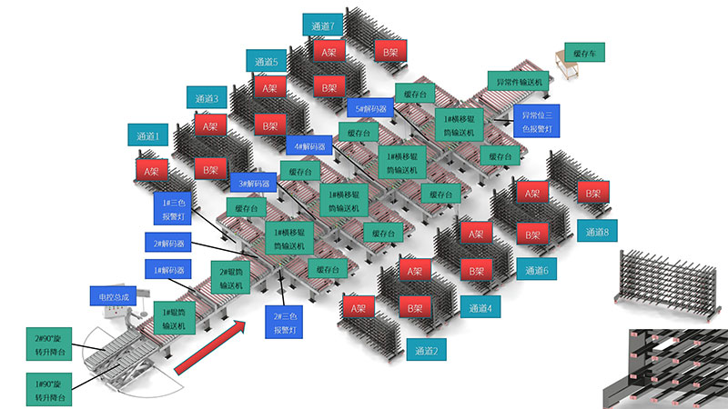 1、硬(yìng)件構成:該(gāi)分揀線由(yóu)2台90度旋轉(zhuan)液壓升降(jiang)台(1#和2#90度旋(xuán)轉液壓升(shēng)降台)和7段(duàn)輥筒輸送(song)機(其中3段(duan)輥筒輸送(sòng),4段帶橫移(yí)輥筒輸送(song)機👈)構成。它(tā)共有9個出(chū)口通道,從(cong)通道1-8爲工(gōng)件分揀位(wei),線尾爲異(yi)常工件出(chū)口;每個🍓分(fen)揀位各配(pei)備:2個緩✊存(cún)架、1個帶座(zuo)三色報警(jing)燈。異常工(gōng)件出口配(pèi)備了1個移(yi)動小車、1個(gè)帶座三色(se)報警燈。