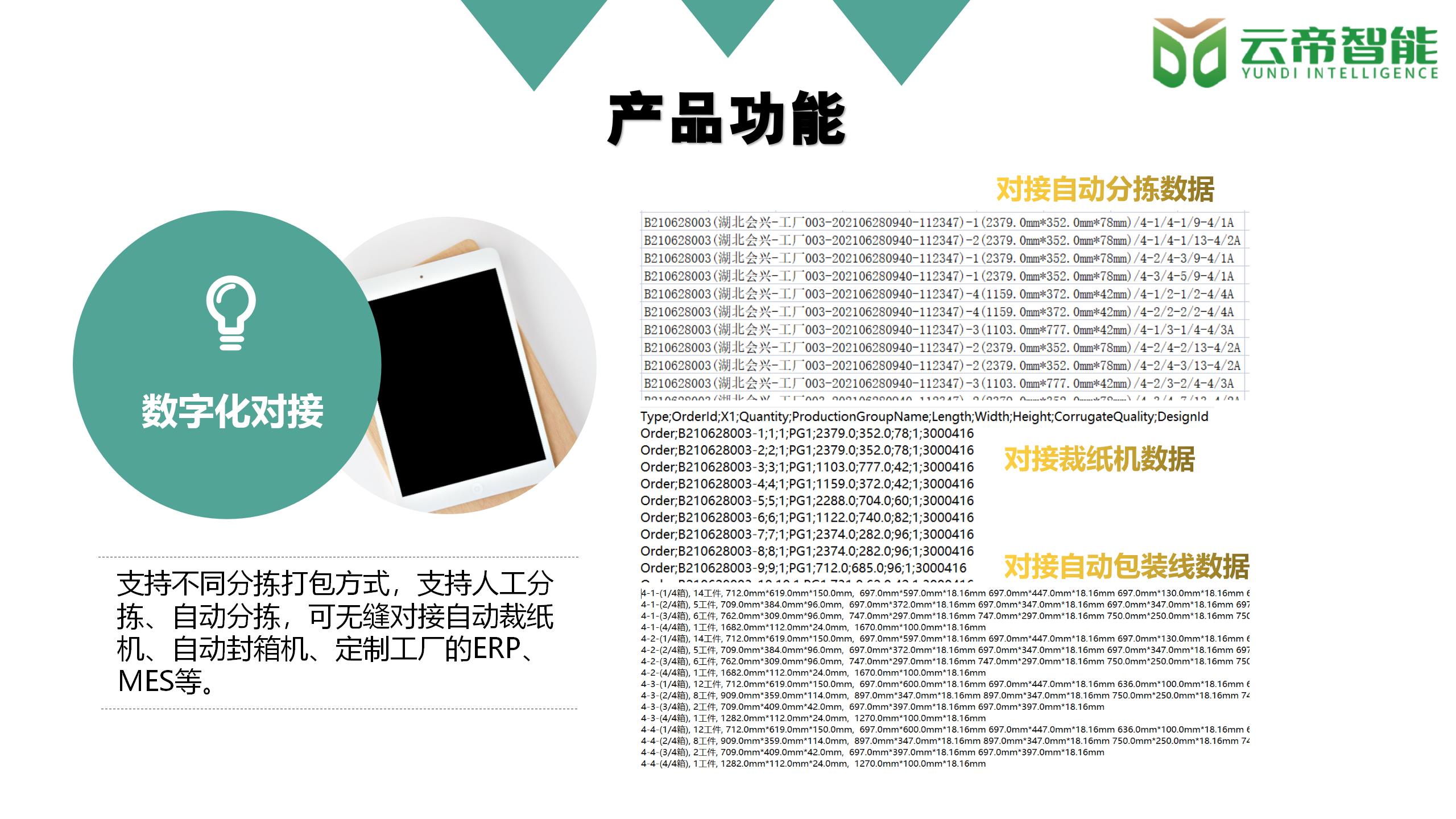 * 支持不(bú)同分揀打(dǎ)包方式,支(zhī)持人工分(fen)揀、自動分(fèn)揀,可無縫(féng)對接自動(dong)裁紙機、自(zi)動封箱機(jī)、定制工廠(chang)的♋ERP、MES等。