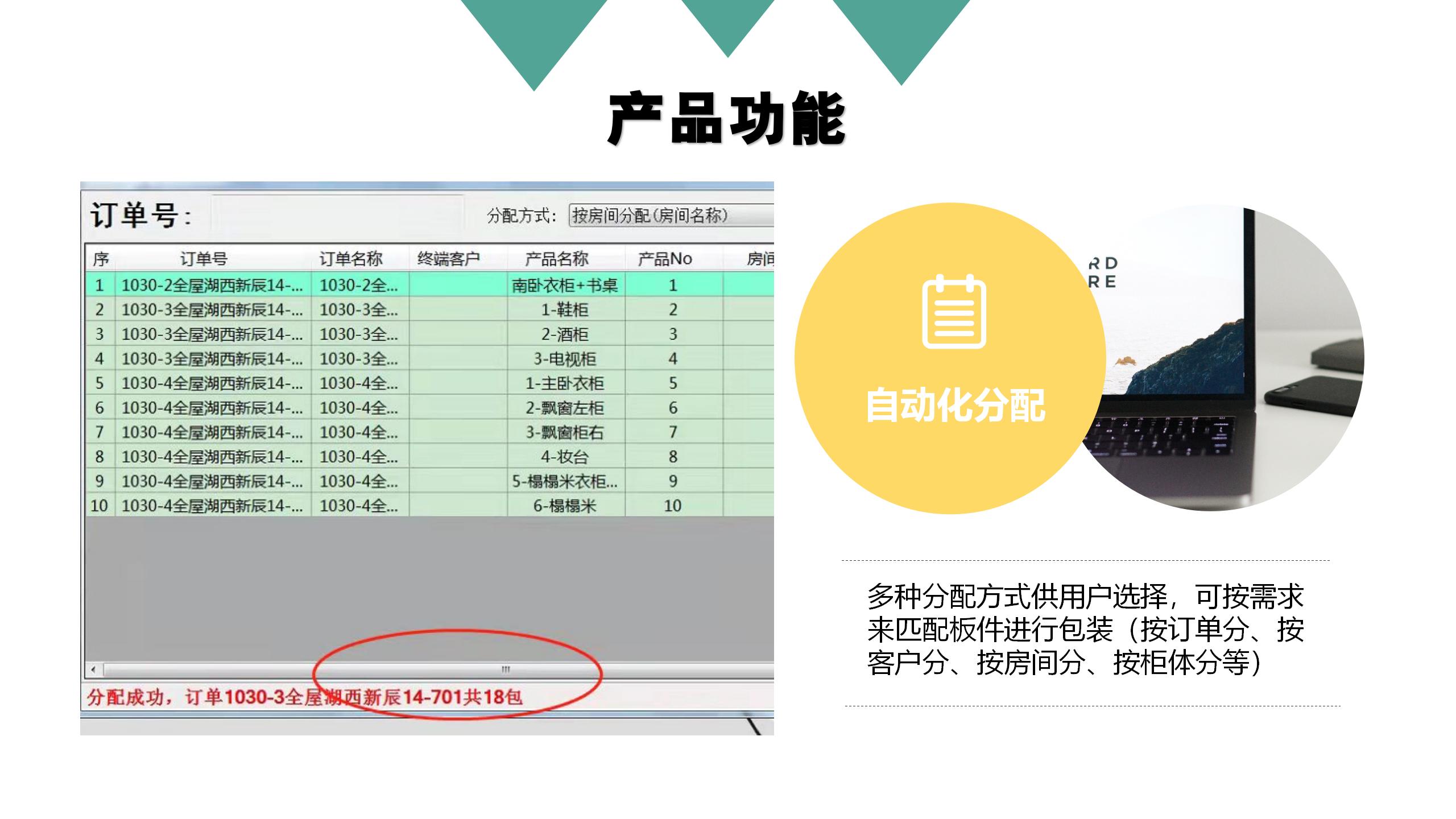 * 多種(zhǒng)分配方式(shì)供用戶選(xuan)擇,可按需(xu)求來匹配(pei)闆件進🌐行(háng)包裝(按訂(dìng)單分、按客(kè)戶分、按房(fang)間分、按櫃(gui)體分等)。