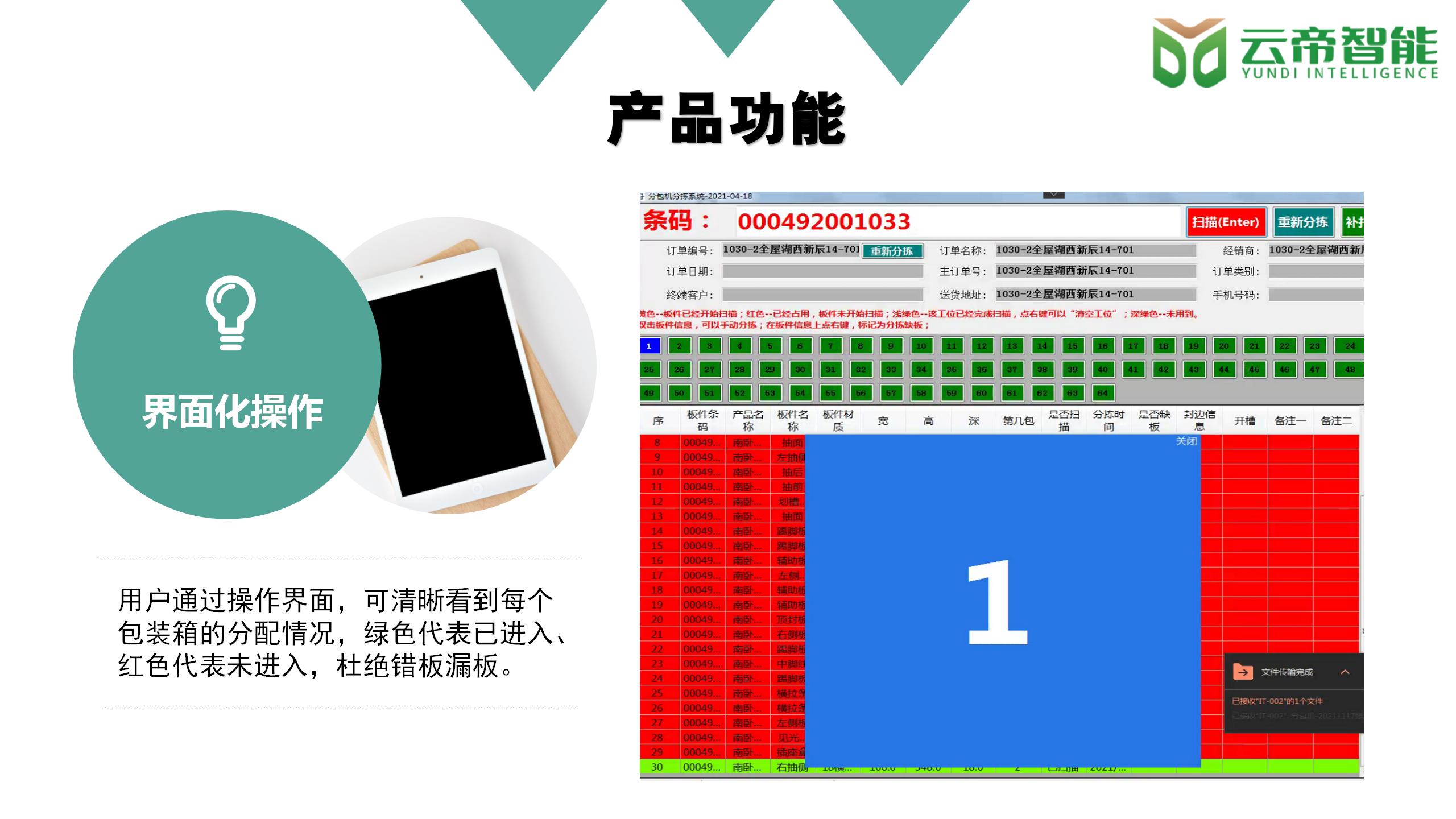 * 基于C++底(dǐ)層語言開(kai)發,通過數(shù)學模型運(yùn)算并自動(dòng)将闆件🔴分(fèn)配到對應(ying)的訂單号(hao)/客戶/櫃子(zǐ)/包/闆件放(fàng)置于該包(bāo)裝☎️的哪一(yi)層,1-3秒高速(su)運算,分配(pei)方式全國(guó)首創。